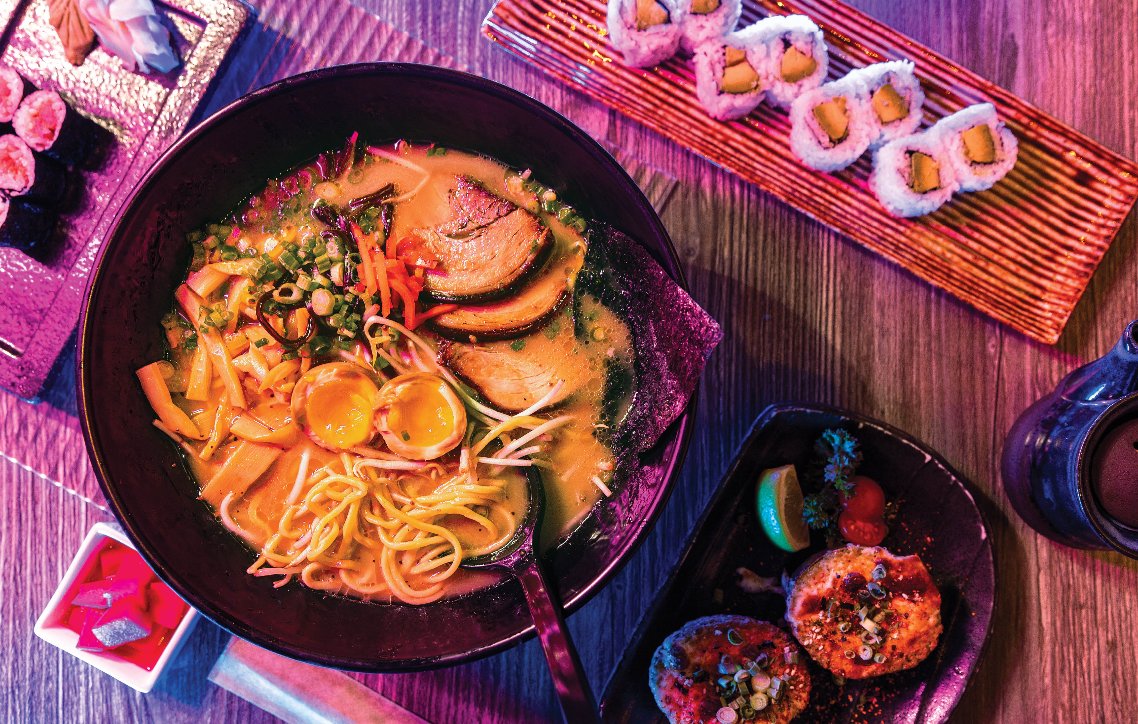 The braised pork and a fried egg make this ramen a protein-packed dish, while seasonal and pickled veggies bring texture, flavor and color to the table. Make it vegan by opting for miso instead of pork belly broth.
